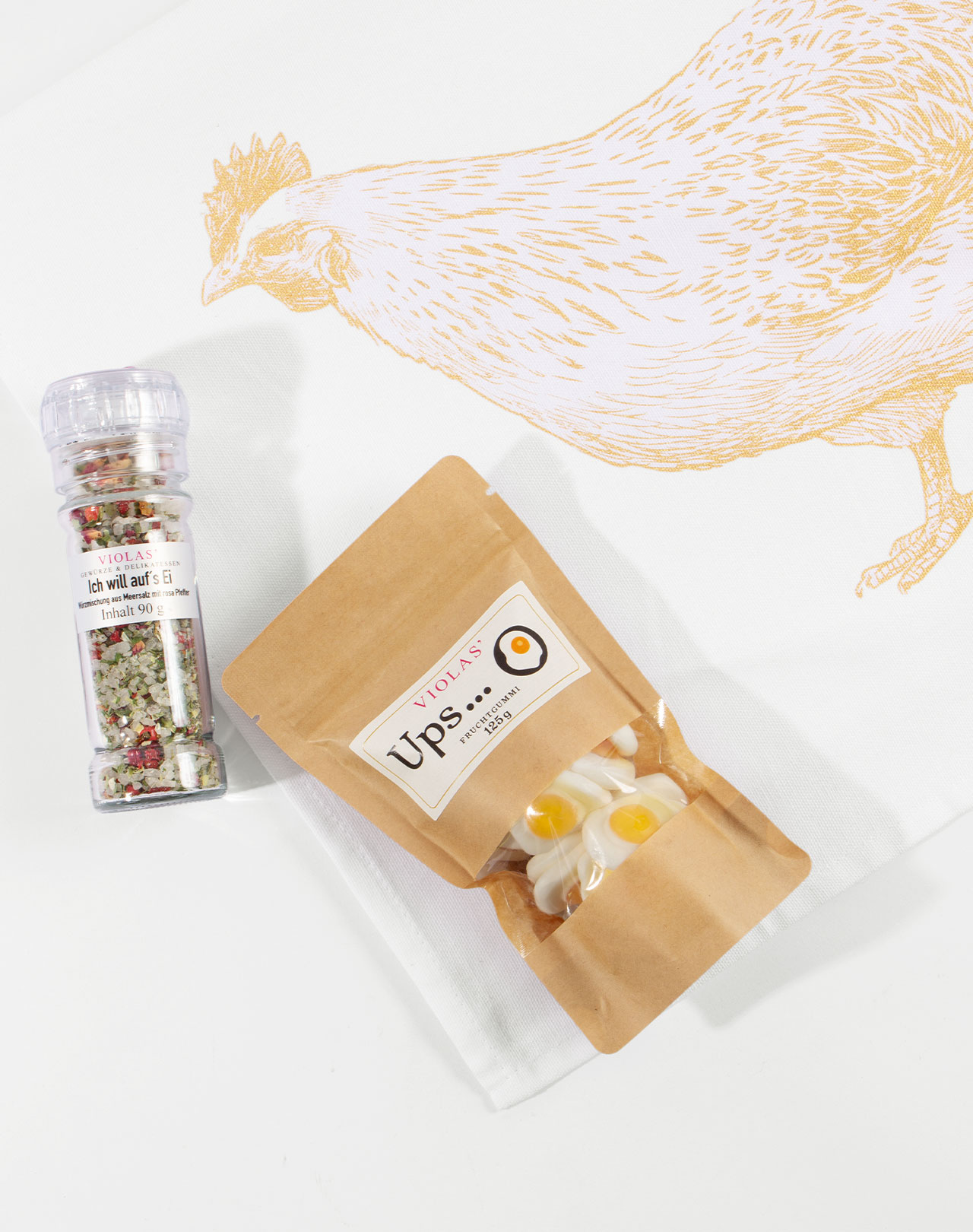 Tauchen Sie ein in die fröhliche Welt des Osterfestes mit unserem charmanten Set »Echtes Ei-Light«. Es enthält das exklusive Geschirrtuch »Golden Chicken«, das nicht nur Ihre Küche schmückt, sondern auch praktisch im Gebrauch ist. Die fruchtigen Fruchtgummis »Ups ... Spiegeleier« bringen einen Hauch von Spaß und Süße in Ihren Tag. Und mit unserer Mühle »Ich will auf's Ei« können Sie Ihre Gerichte spielend leicht verfeinern. Alles in einer schönen Tüte mit Geschenkband präsentiert. Genießen Sie mit unserem Set das Osterfest in vollen Zügen und verbreiten Sie Freude und Leichtigkeit.