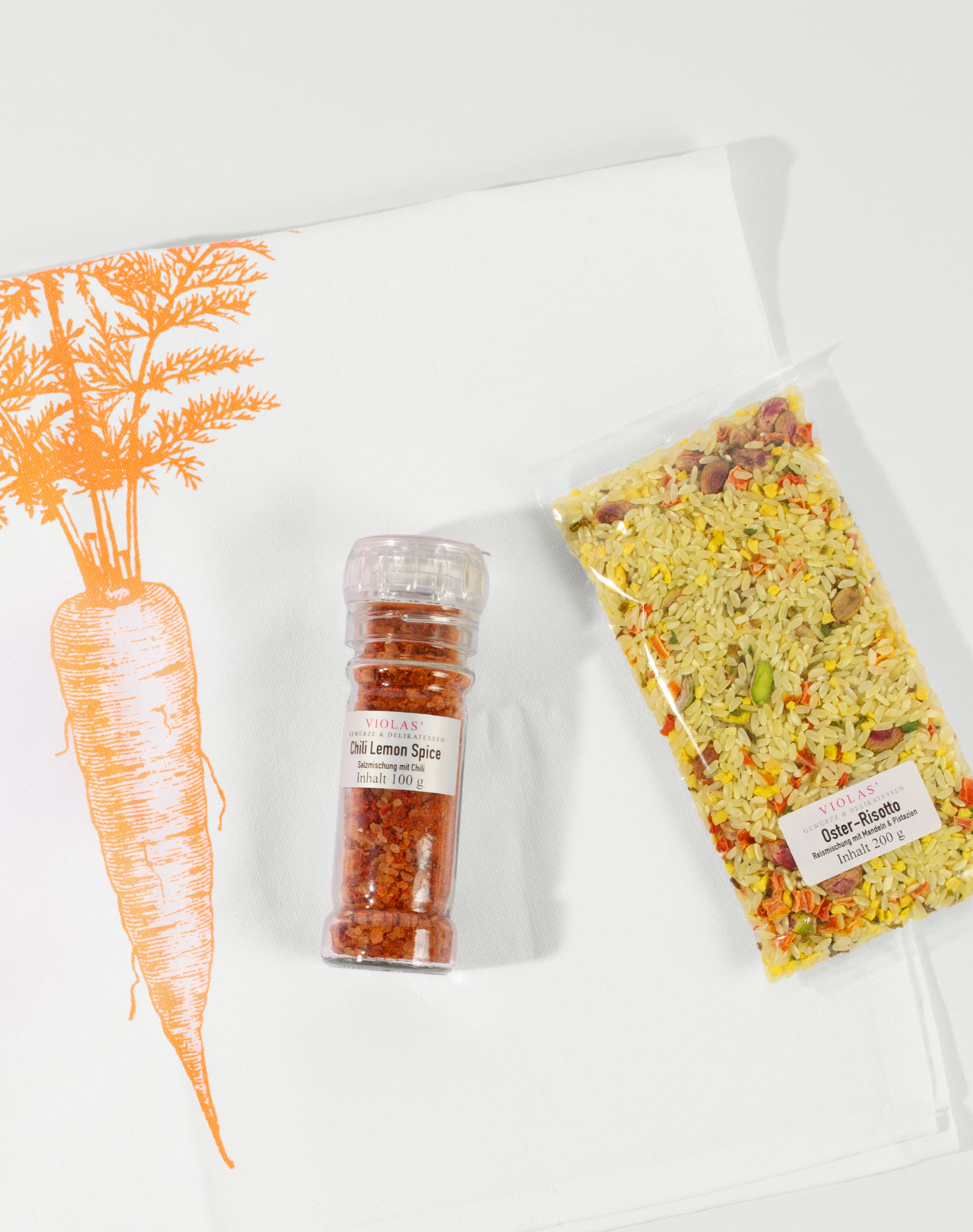 Bringen Sie Schwung in Ihr Osterfest mit unserem Volle Möhre Geschenkset. Es umfasst ein auffälliges Geschirrtuch »Fancy Möhrchen« in Neon Orange, unsere würzige Mühle »Chili Lemon Spice« und ein köstliches »Oster-Risotto«. Dieses kulinarische Osternest wird in einer stilvollen weißen Papiertüte mit Schleifenband geliefert, perfekt für jeden, der das Besondere liebt!