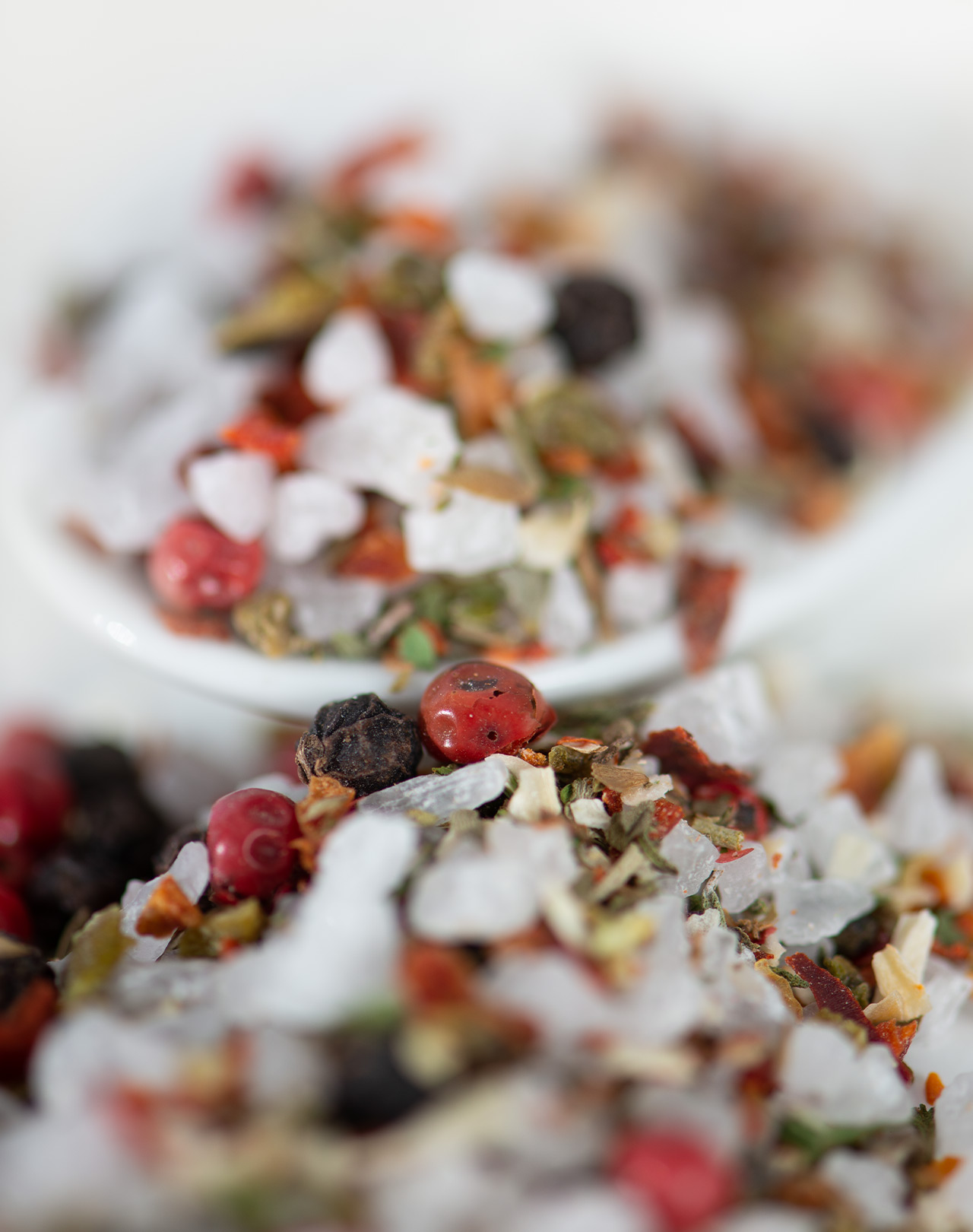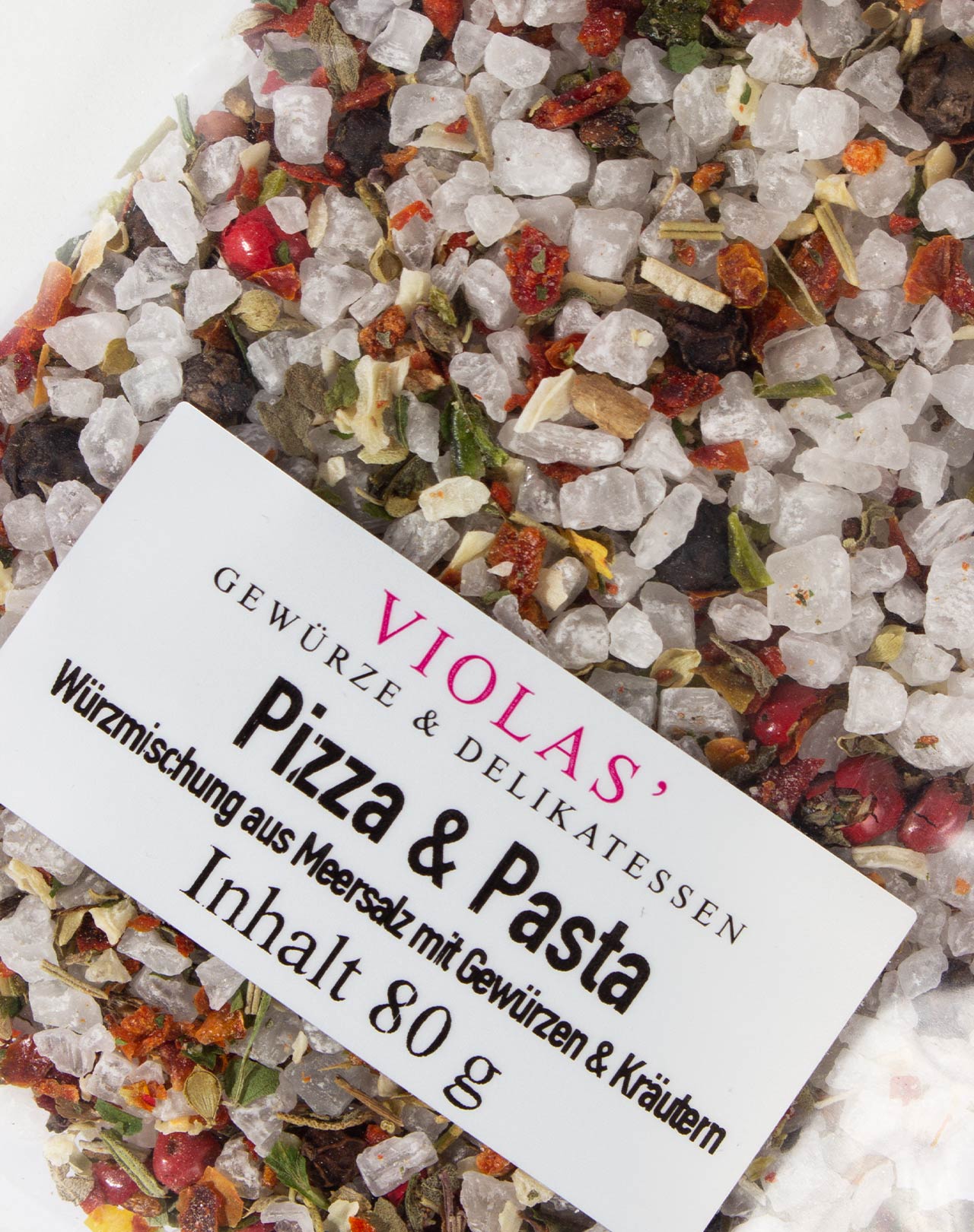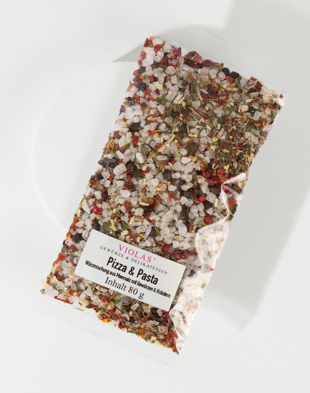 Unsere Würzmischung »Pizza & Pasta« enthält edle Meersalzkristalle und Kräuter wie Oregano, Basilikum, Thymian. Ergänzt mit Zwiebeln, Knoblauch, Chili und zwei Sorten Pfeffer wird diese Mischung zu einem Geschmacksturbo für Pizza, Pasta & Co.