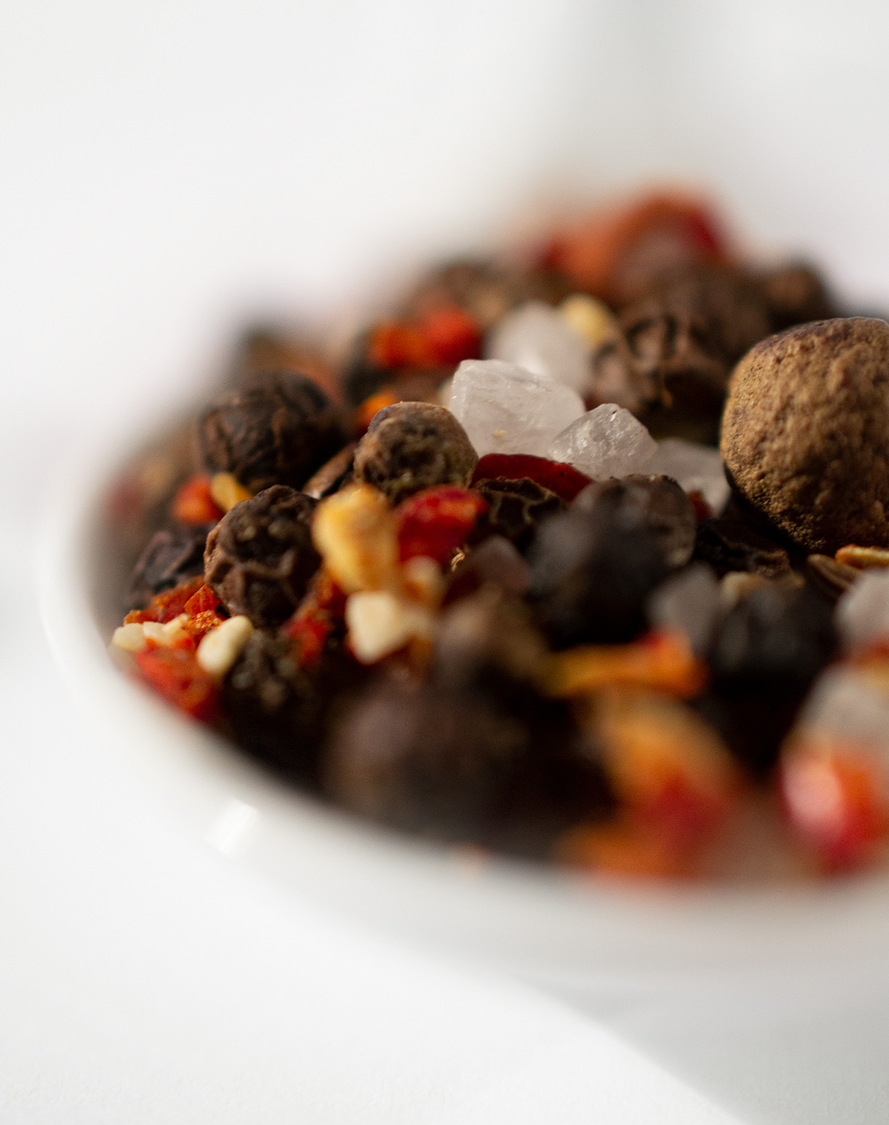 Pfeffer, Paprika, Piment, Meersalz 9,6%, Knoblauch, Kümmel, Macis