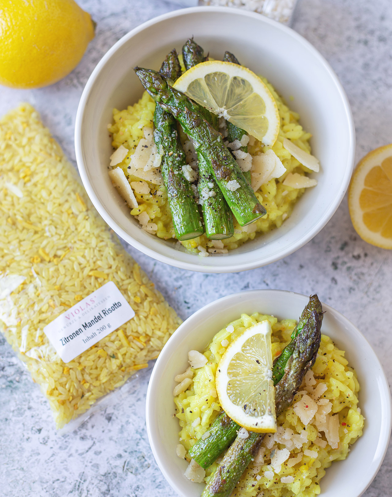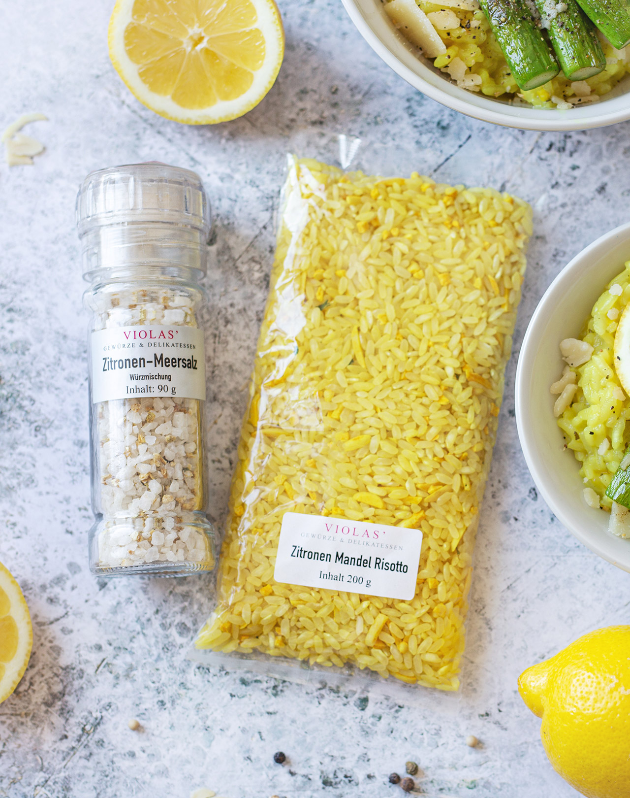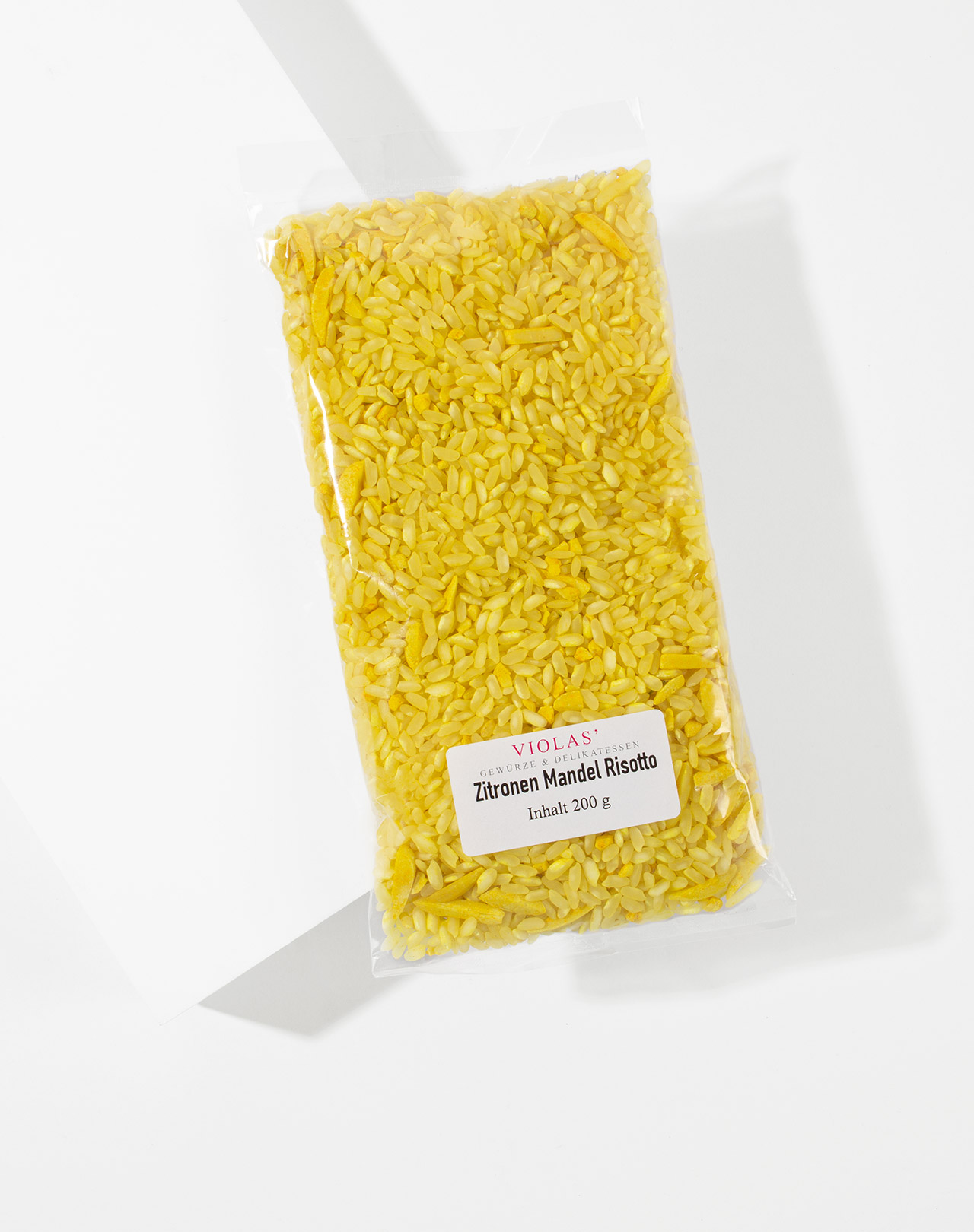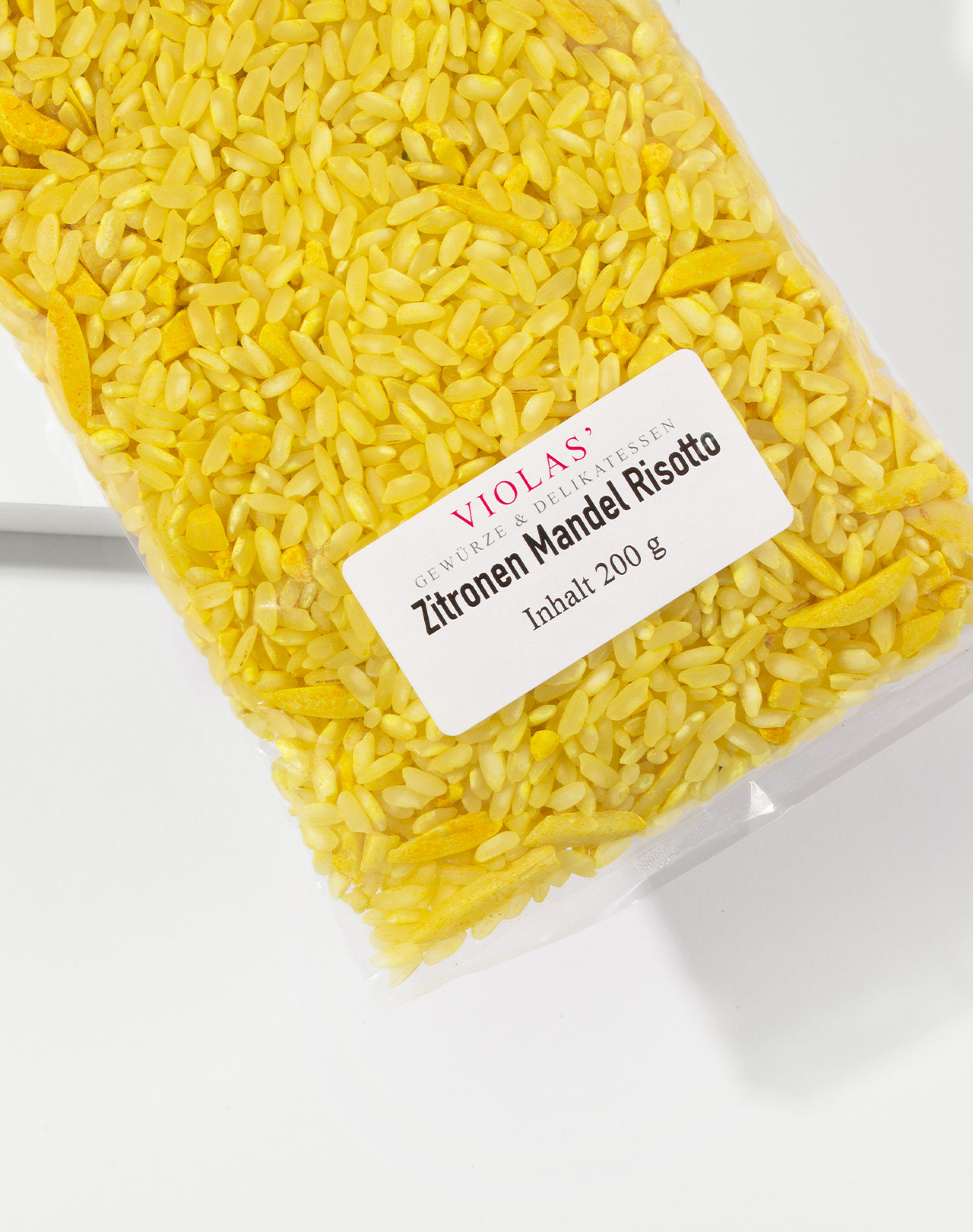Diese Risottomischung enthält echten Arborio-Reis und wird mit Mandeln, Kurkuma und Zitronenessenz zu einem sommerlichen Begleiter von Fisch- und Geflügelgerichten. Verfeinert mit Cocktailtomaten, Basilikum und Parmesan wird die Mischung ein vegetarisches Hauptgericht.
