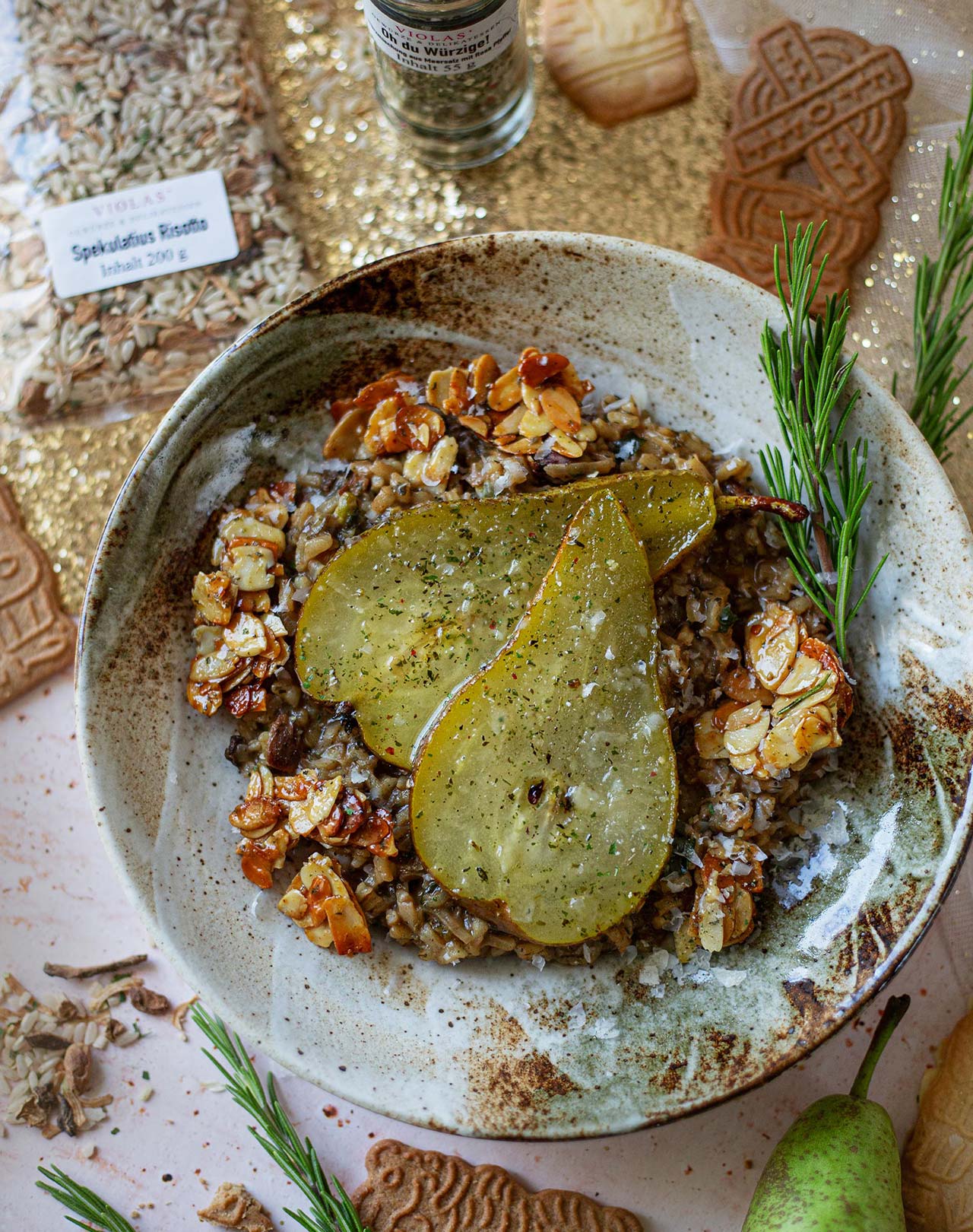 Spekulatius Risotto mit Birne & Honig-Mandeln