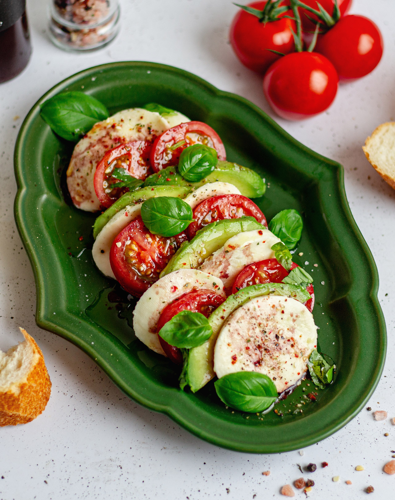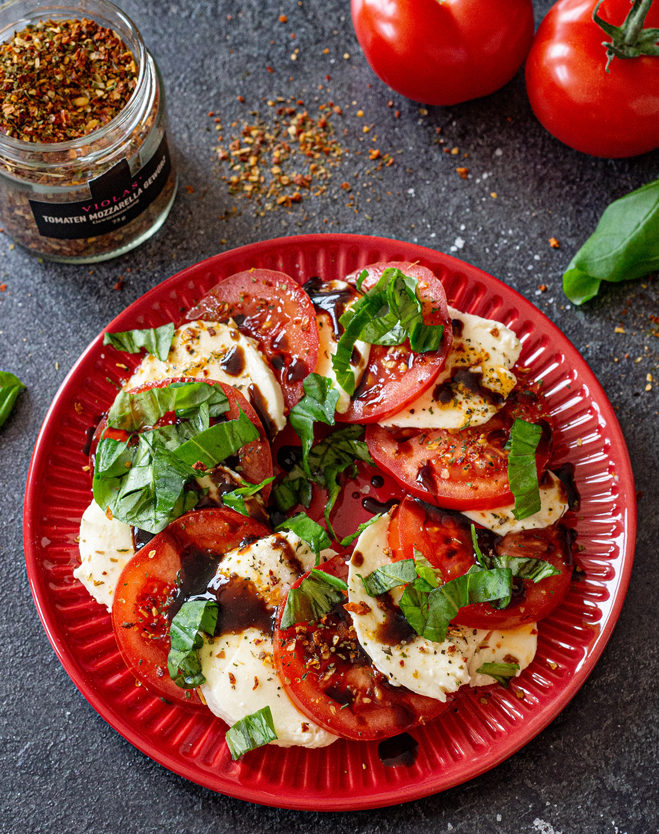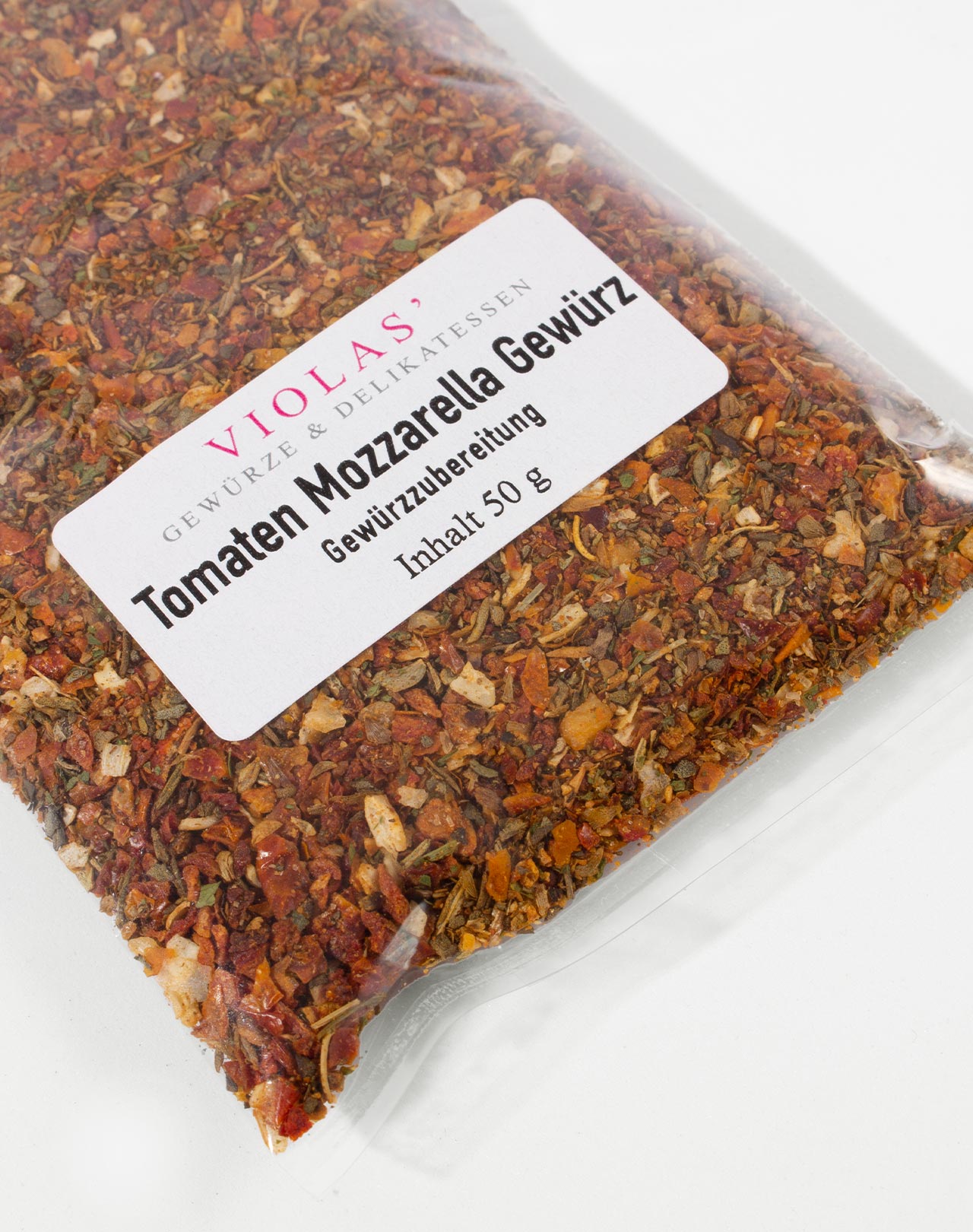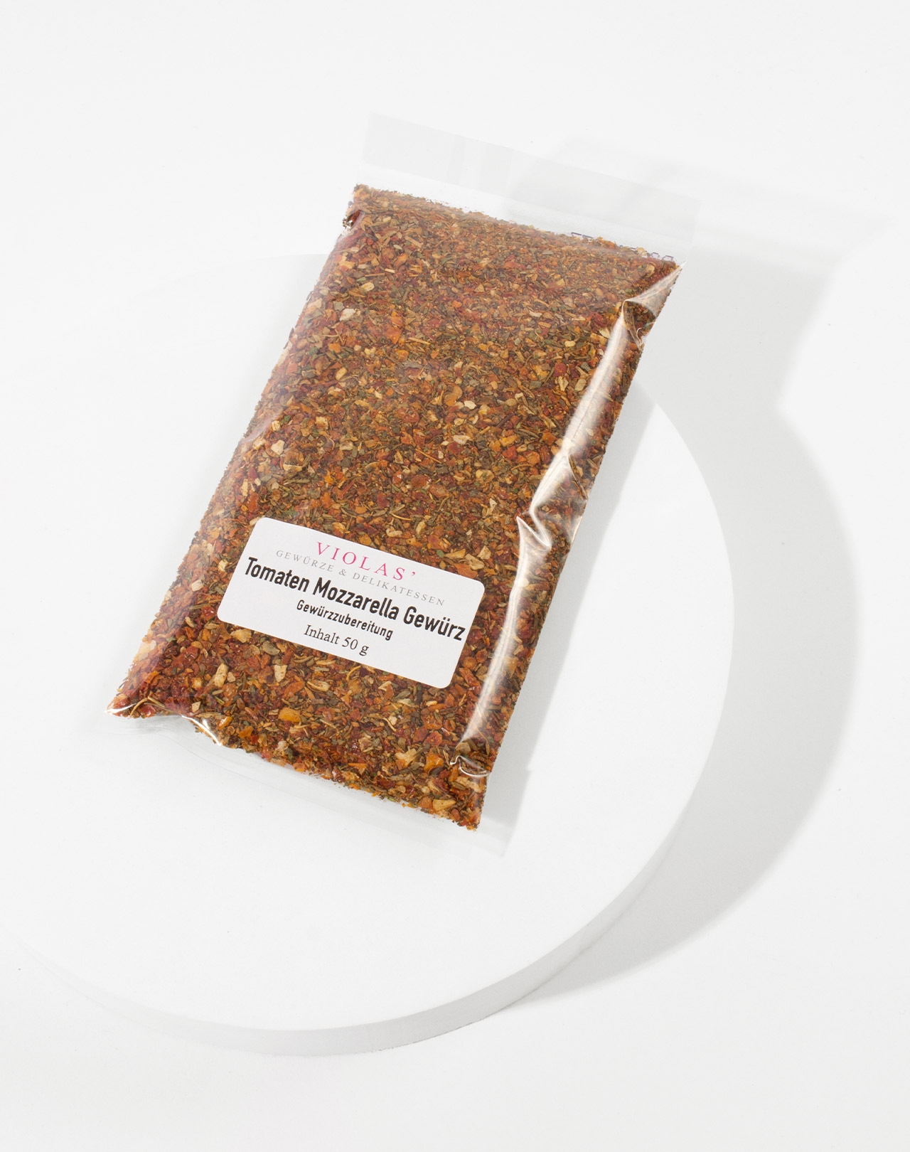 Für die klassische Kombination Tomate-Mozzarella gibt es viele Rezepturen – als warme oder kalte Speisen. Mit dieser Gewürzmischung aus Tomaten, Zwiebeln, Basilikum, Knoblauch und mehr verleiht man dem Salat Caprese, der Bruschetta; Butter oder dem Gemüse einen feinen mediterranen Geschmack.