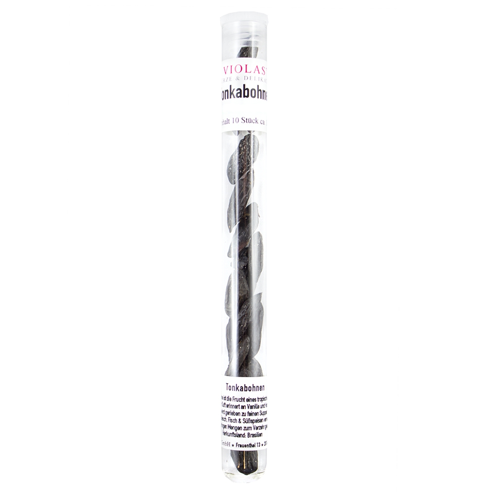 Die Tonkabohne ist die Frucht eines tropischen Baumes und ihr Duft erinnert an Vanille, Rum und Mandeln. Sie wird am Besten mit einer Muskatreibe gerieben und zum Beispiel in feinen Suppen, Soßen, Fleisch, Fisch und Süßspeisen verwendet. Aber auch Keksen und Kuchen gibt die Tonkabohne einen einzigaritgen Geschmack. Für Desserts die auf Sahne oder Milch basieren, kocht man die Bohne etwa zehn Minuten aus. Nur in geringen Mengen zum Verzehr geeignet!