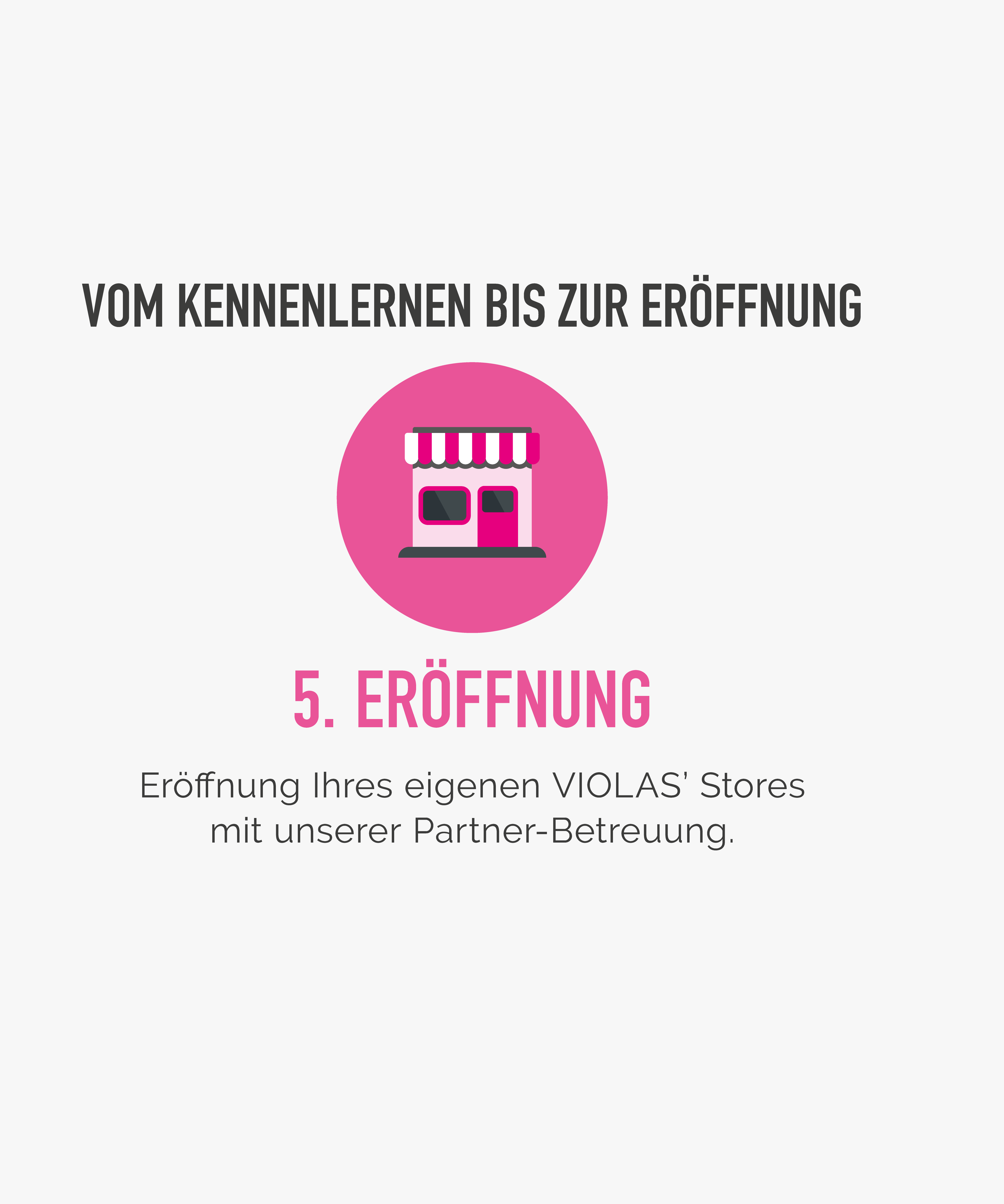 Dennoch will der Schritt in die Selbstständigkeit gut geplant werden. Und dabei helfen wir Ihnen! Wir begleiten Sie auf dem Weg bis zur Eröffnung Ihres VIOLASʼ Stores. Im Gegensatz zu einer Selbstständigkeit „auf eigene Faust“ greifen Sie bei uns auf ein vielfach bewährtes Konzept zurück – auf langjährige Erfahrungen, Netzwerke und das Know-how eines ganzen Systems. Standortsuche, Mietverträge, Verhandlungen mit der Bank u.v.m. haben schon viele Partner vor Ihnen bewältigt, weil sie nicht allein vor diesen Aufgaben standen.