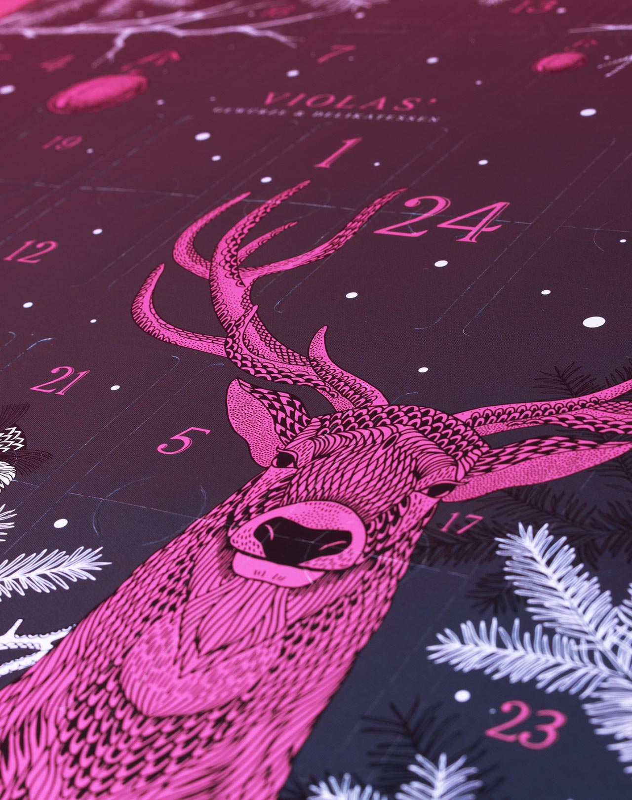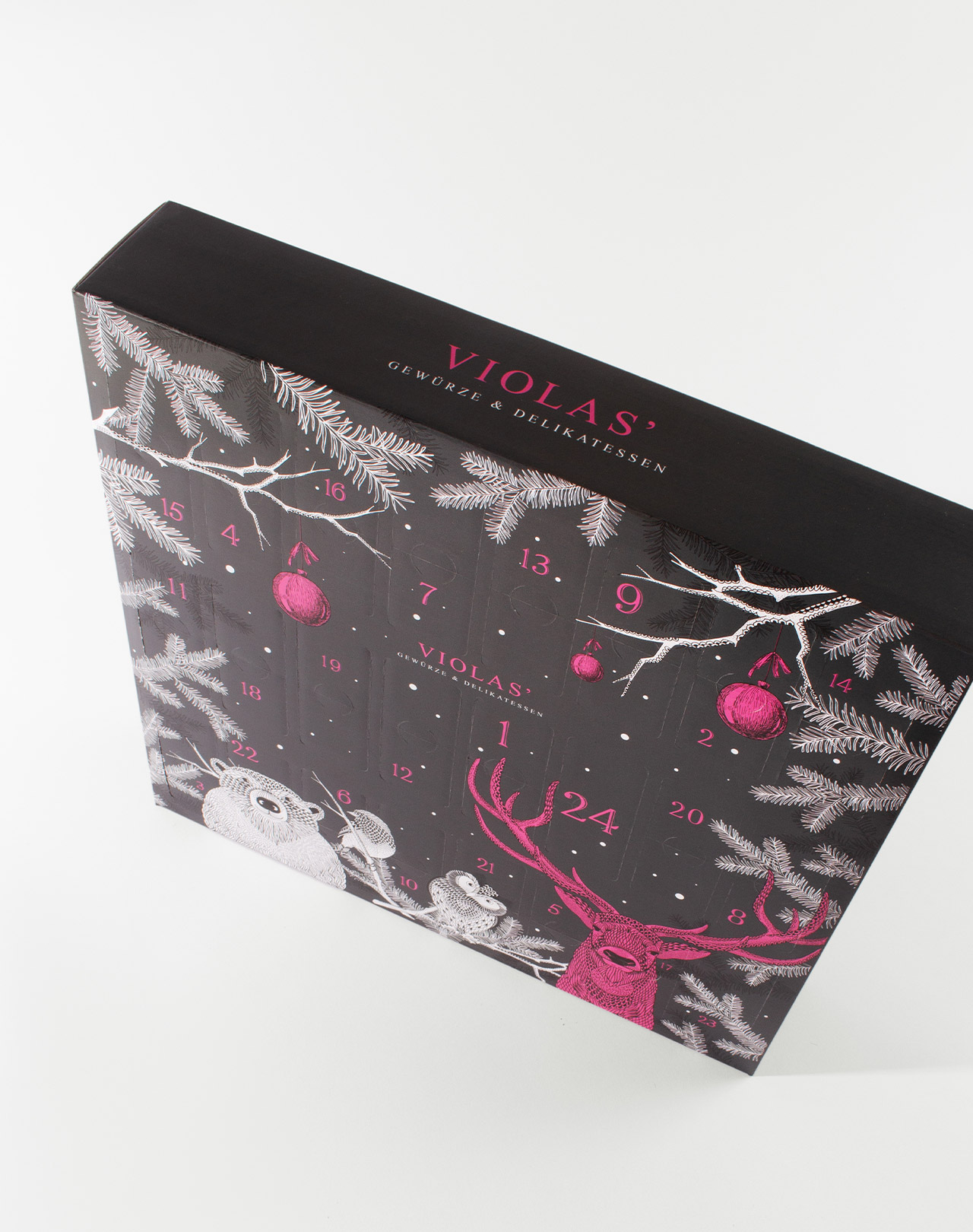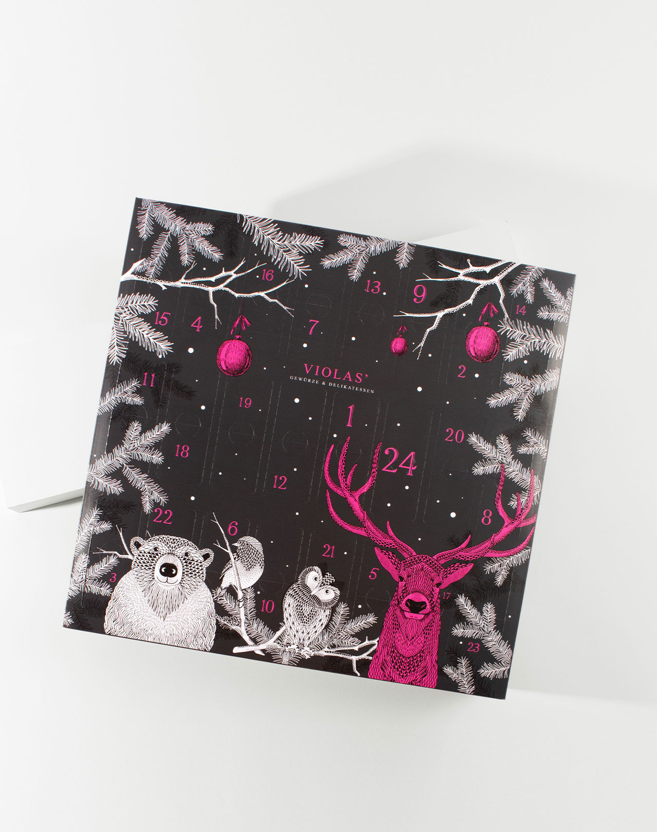Bei VIOLAS' setzen wir auf eine moderne Interpretation dieses Brauchs und bieten mit unserem Adventskalender »Winterzauber« eine stilvolle Variante an. Der Kalender überzeugt durch sein edles Design in Grau, Pink und Weiß und entführt in einen zauberhaften Winterwald, der mit seinen verschneiten Tieren und einem pinken Hirsch zum Träumen einlädt. Hinter jedem der 24 Türchen verbirgt sich eine köstliche Überraschung, die nicht nur die Augen, sondern auch den Gaumen erfreut. Für alle, die ihren eigenen Adventskalender gestalten möchten, bieten wir bei VIOLAS' eine breite Auswahl an exquisiten Leckereien. Unsere hochwertigen Pralinen, Gewürzmischungen und andere Feinkostprodukte eignen sich hervorragend, um einen DIY-Adventskalender zu befüllen und ihn zu einem ganz persönlichen Geschenk zu machen. So wird jede Tür zu einem Moment voller Genuss und Vorfreude.