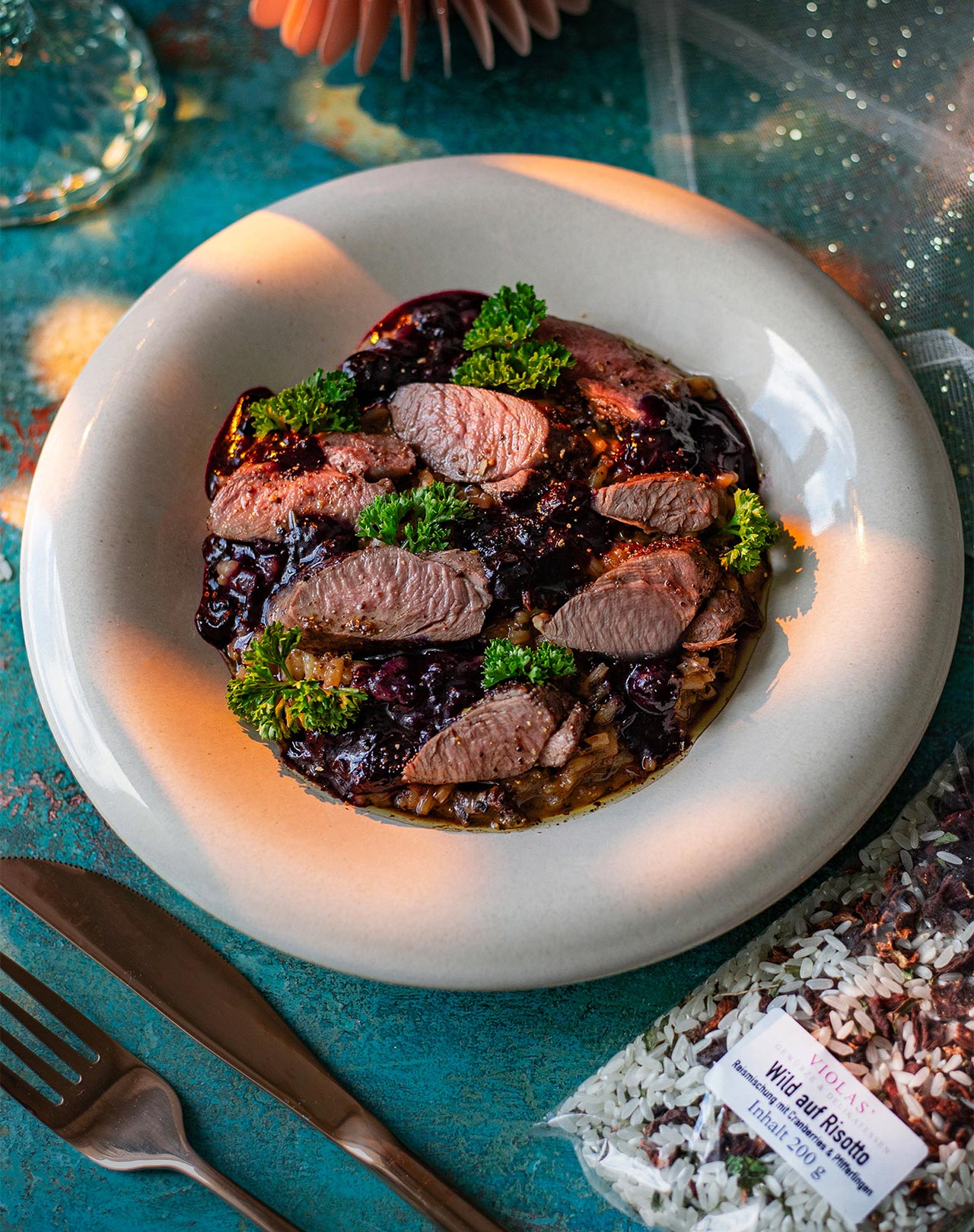 Edler Arborio Reis macht dieses Risotto so herrlich cremig! Die Reismischung ist mit Cranberries, Pfifferlingen, Wacholderbeeren und Rosmarin gewürzt und wird so zum idealen Begleiter für Wildgerichte. Die Menge ergibt ein Hauptgericht für zwei Personen oder ist als Beilage für vier Personen ausreichend.